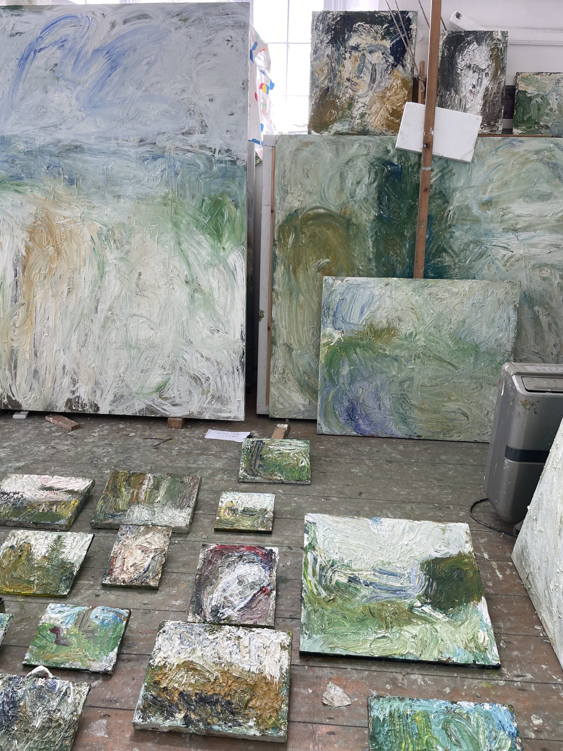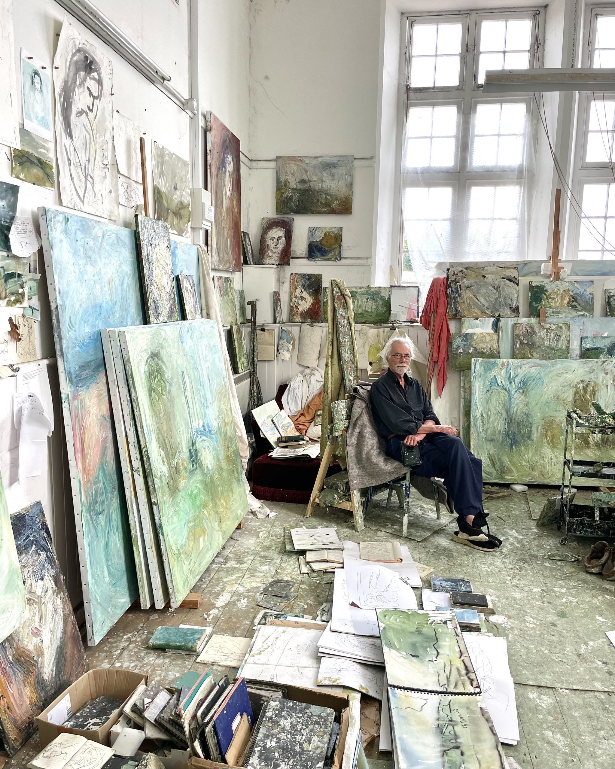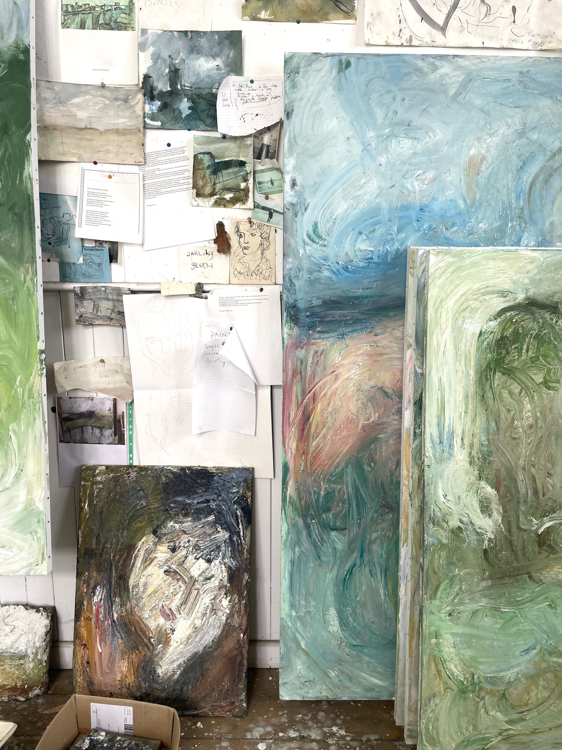 My studio space encapsulates my creative process: quick sketches snatched from glimpses of the natural world, stacks of smaller canvases constantly evolving, poetry books on the paint-encrusted floor, high ceilings and light complementing the sense of space in my larger paintings.