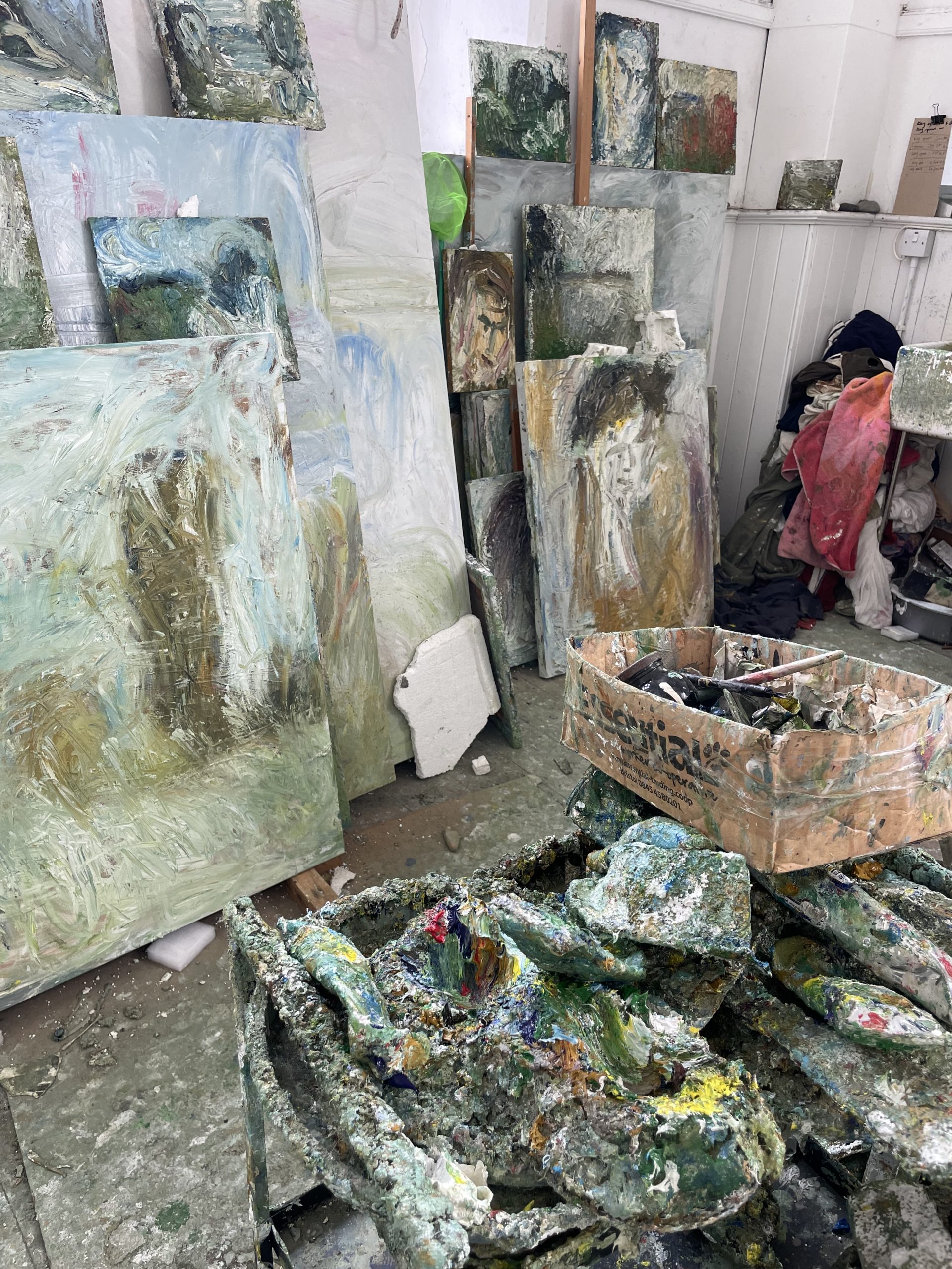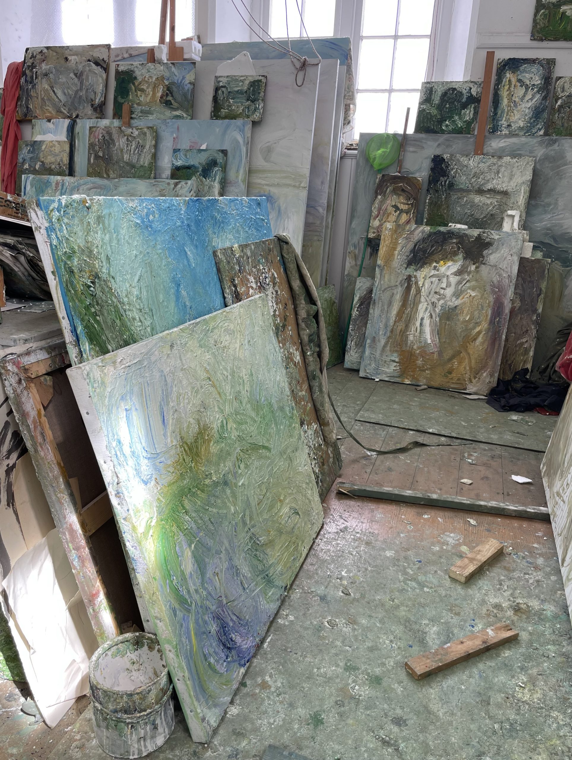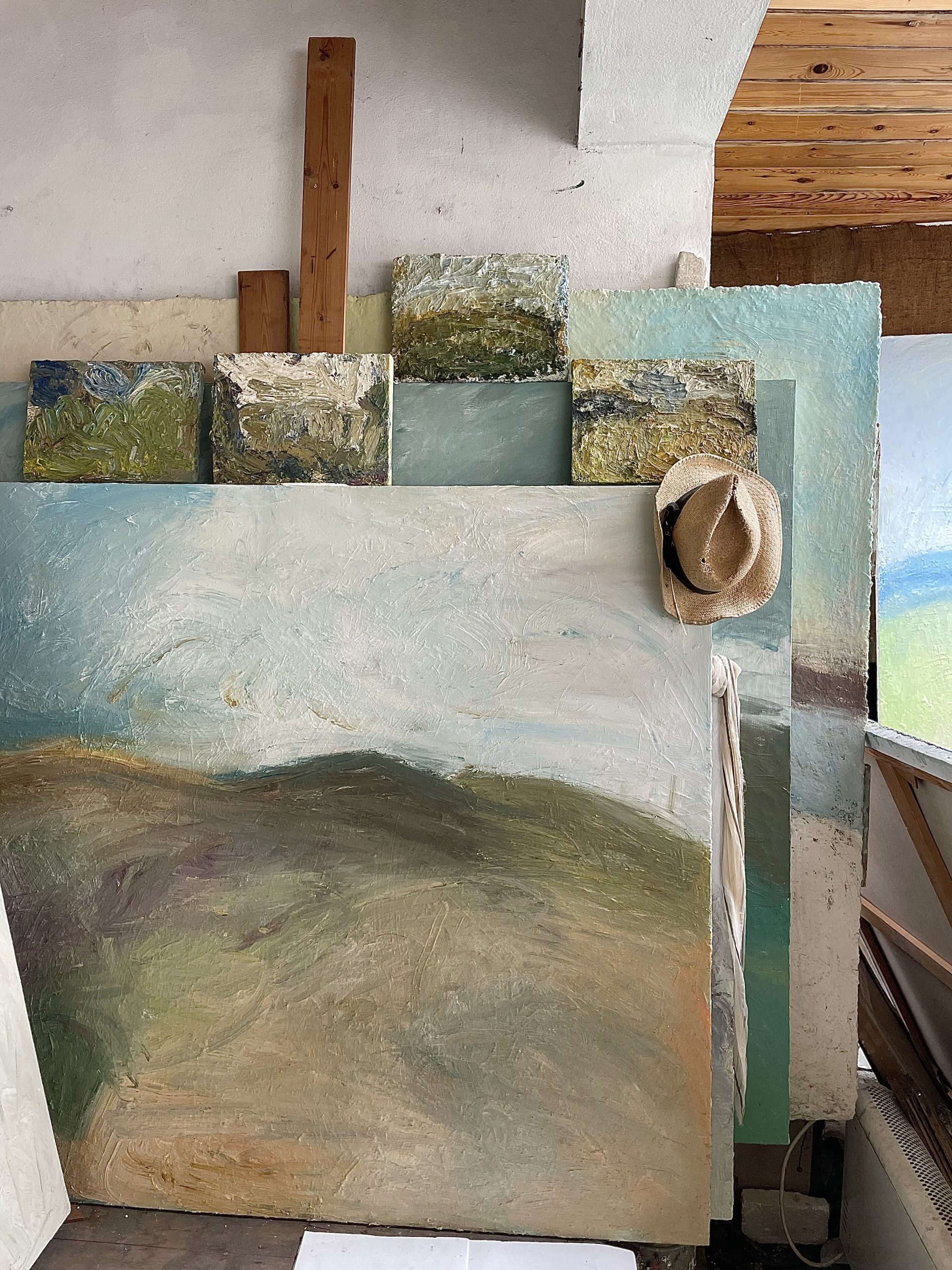 My studio space encapsulates my creative process: quick sketches snatched from glimpses of the natural world, stacks of smaller canvases constantly evolving, poetry books on the paint-encrusted floor, high ceilings and light complementing the sense of space in my larger paintings.